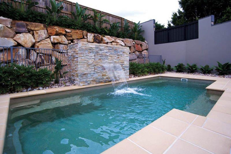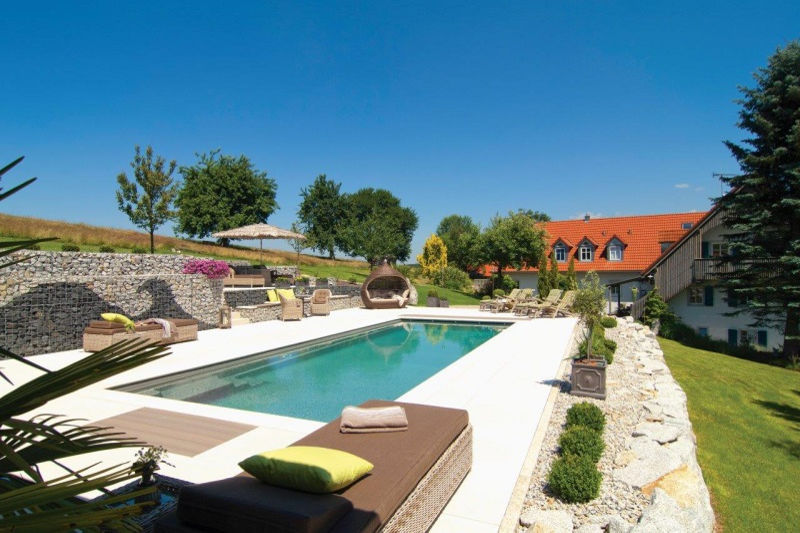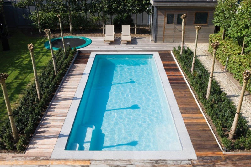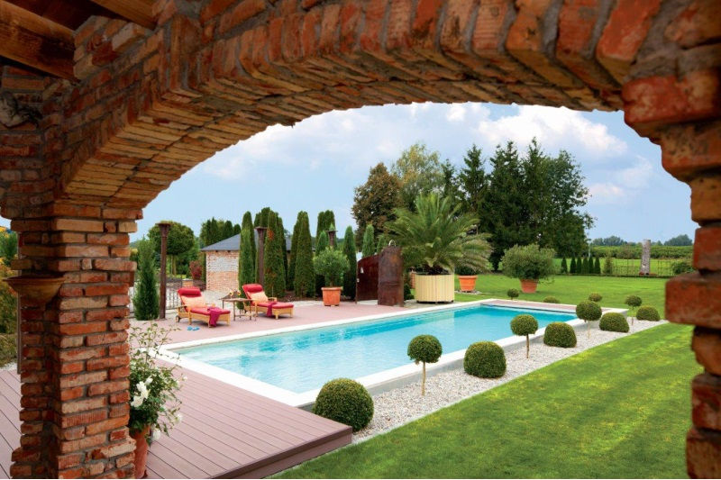 Plaża basenu może być wykończona z wykorzystaniem kamieni brzegowych, deski tarasowej lub innych wodoodpornych materiałów.